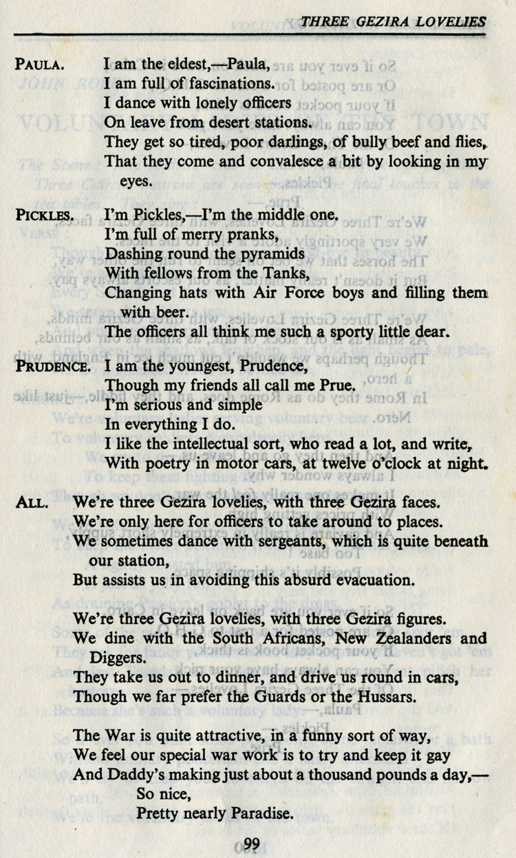 Three Gezira Lovelies, on page 98, by John Ropes is a three page verse drama: